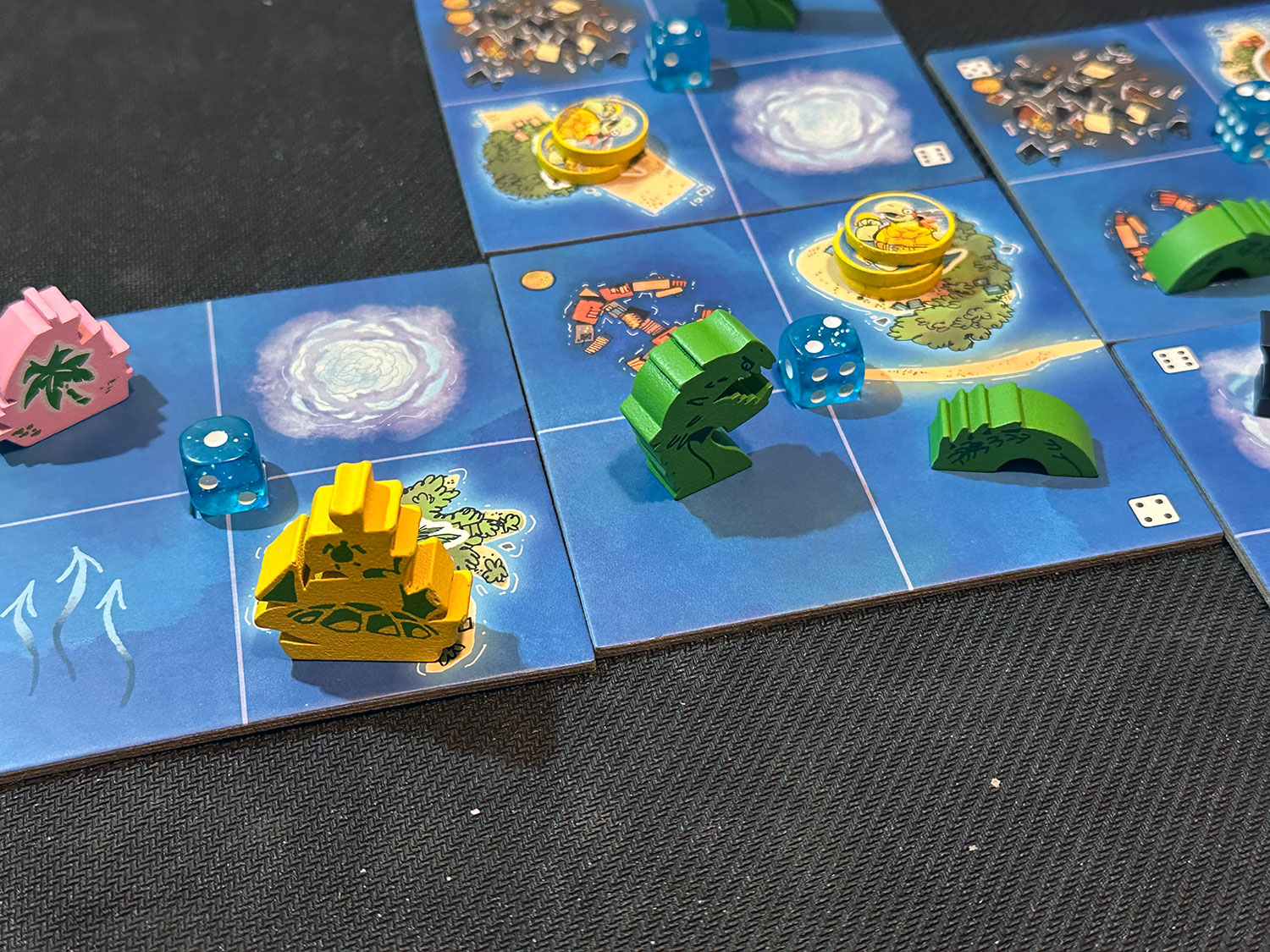 At a basic level, this is similar to their predecessors. But beyond this basic level, they do diverge quite a bit. Rather than devoting dice actions to placing Comrades like the Mollusk Union, many of the Shellfire Rebellion’s Comrades are placed far more hilariously: by being launched across the sea. They have a small secondary player board specifically for their Launchers (a secondary ship they can build). At the start of every round, you roll a range die that has numbers 1, 2, and 3 on it and place the die on this secondary board. Whenever you can launch Comrades that round, they go exactly that number of spaces. This creates some different movement choices. You need to be thinking about how to move your loaded Launchers and Flagship into positions that will be advantageous for launching at the end of that round.