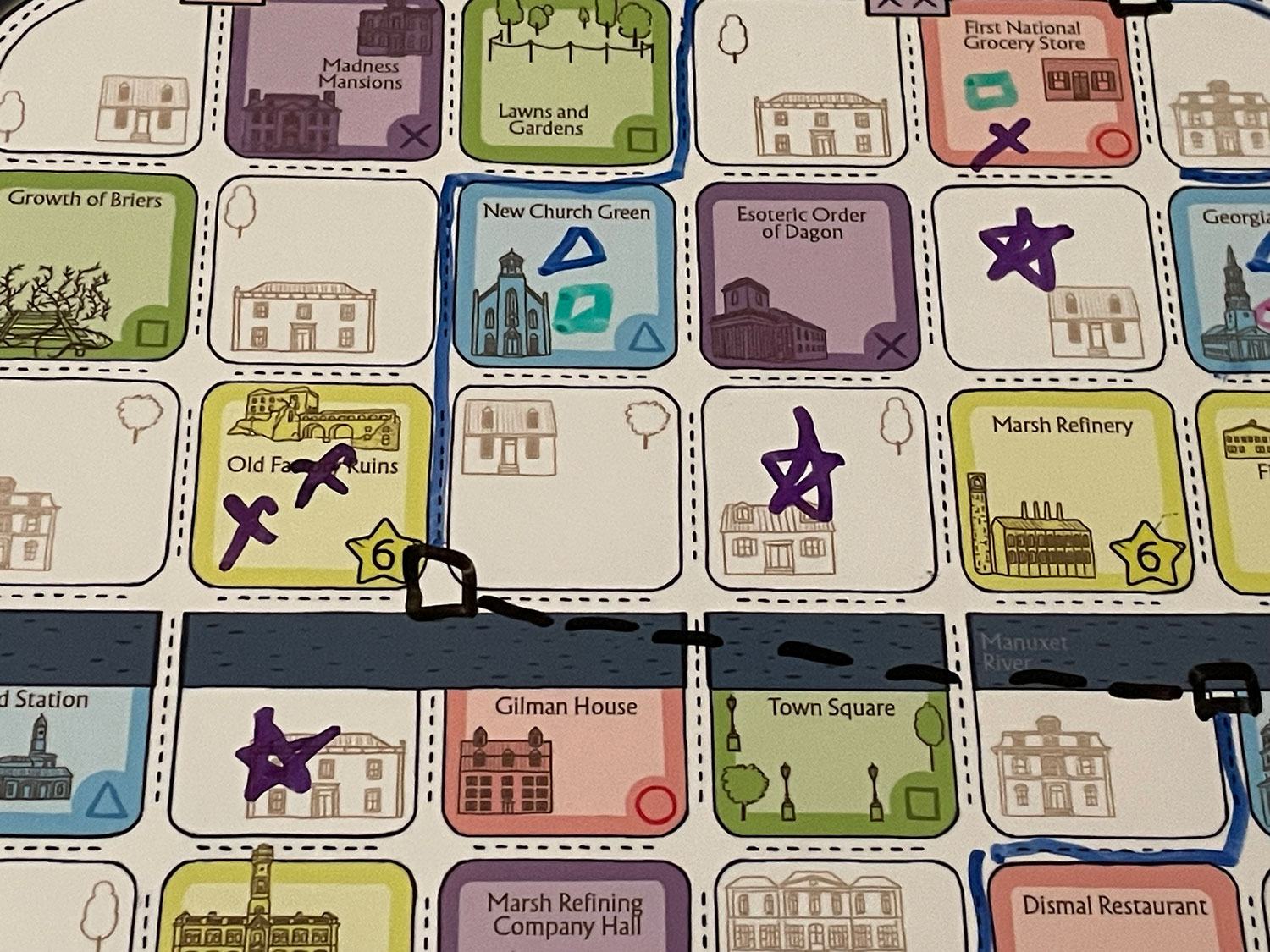 Overall, the Arkham and Innsmouth Travel Guides materials are great, and the artwork fits the theme and is creepy good. These games do come in blister packaging, which was done to keep manufacturing and consumer costs low, and they’re fine. But, being that this is a roll-and-write, the dry-erase markers included are of poor quality. Drawing routes is not bad, but when you must draw any detail like horrible places or tourists, the markers are blunt, plus the ink does not hold shape, and so most detail turns to unreadable smudges. During our first game, we stopped and grabbed other color markers, and I have never used the ones included again.