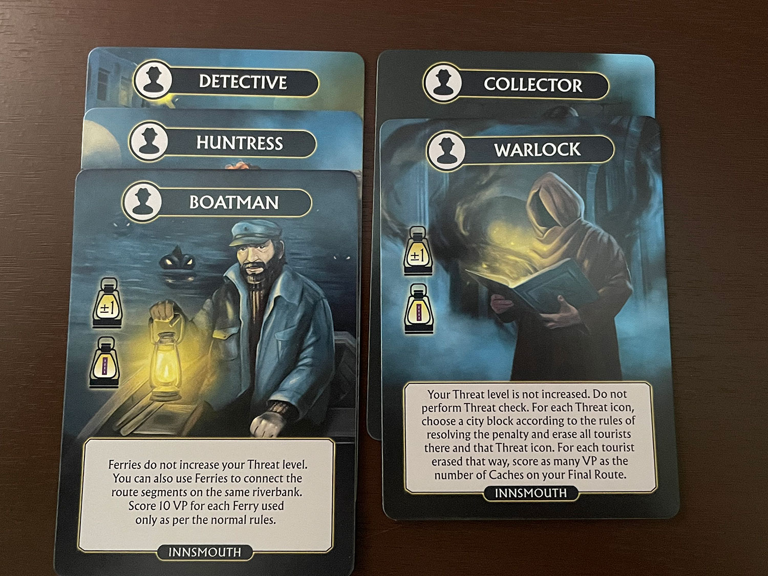 Both Arkham and Innsmouth Travel Guides have great luck mitigation mechanics to help players out if the dice rolls or map routes are not ideal. Arkham players can benefit from curio cards that can give bonus tourist placement, better route or dice options (and end game bonuses), and portals might cause madness, but these are great options for your final route. Innsmouth players will benefit from being able to use a bonus die each round for more route options, character special actions, ferries, which again generate threat but help your final route, and caches that give you artifacts for end-game bonuses. Both games give players many different ways to change dice rolls and routes.
