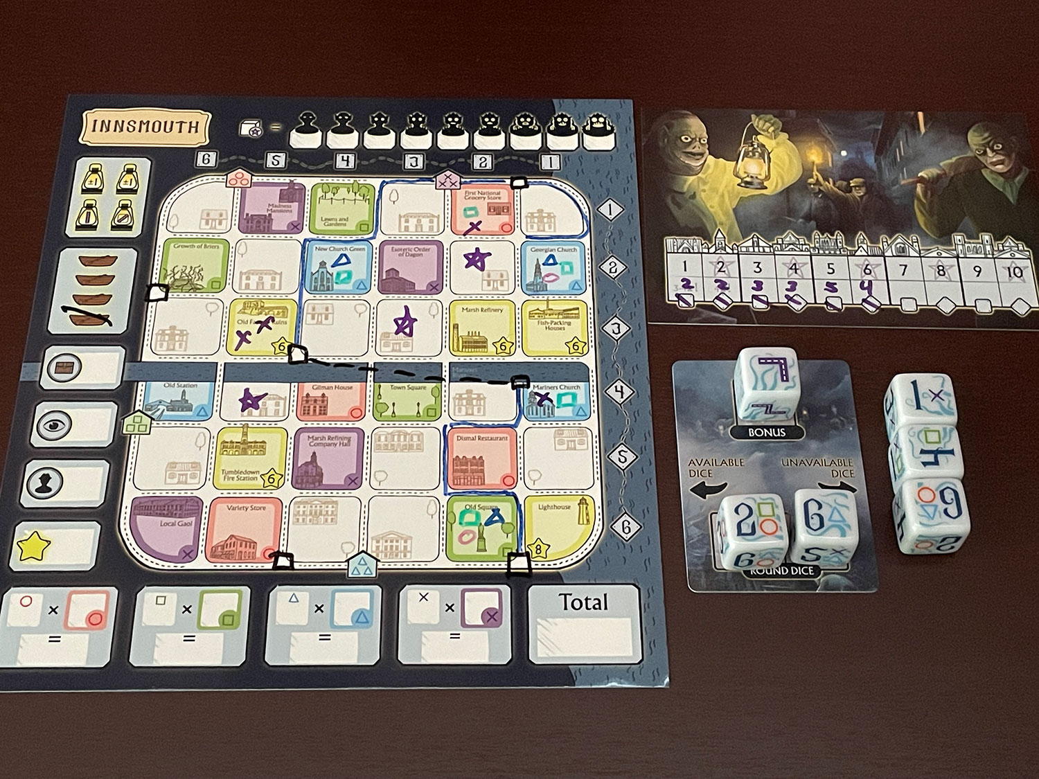The Arkham and Innsmouth Travel Guides follow the same base rules with differences that I will highlight. Players first select their map grid, a dry erase pen, draw an objective card (keeping it secret from other players) for end game scoring, and place the dice selection card in reach of the random first player.