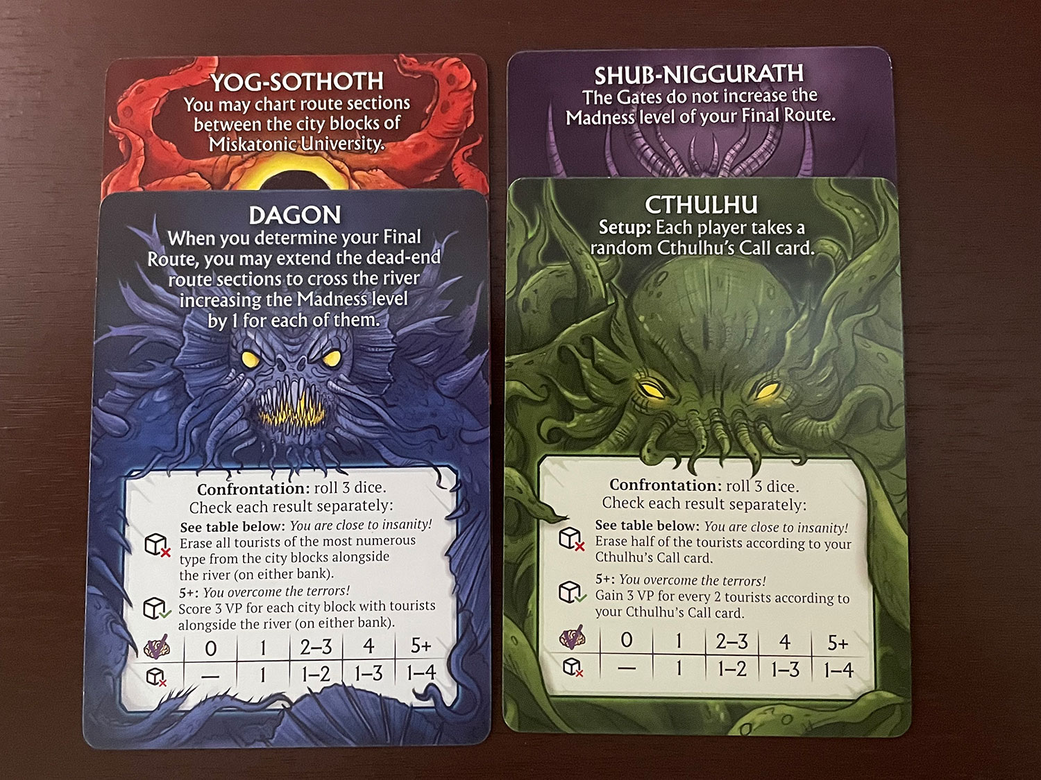 Themes usually don’t make or break a game for me, but they do lure me in, and that was the case for the Arkham and Innsmouth Travel Guides. I mean, the theme is both silly and macabre. You are a travel guide trying to show tourists places that interest them while mapping the best route between these two Cthulhu Mythos cities, especially Innsmouth. You are also trying to avoid losing any for end-game scoring. I mean, what’s the worst that can happen? “Hey kids, look a Great Old One?!”