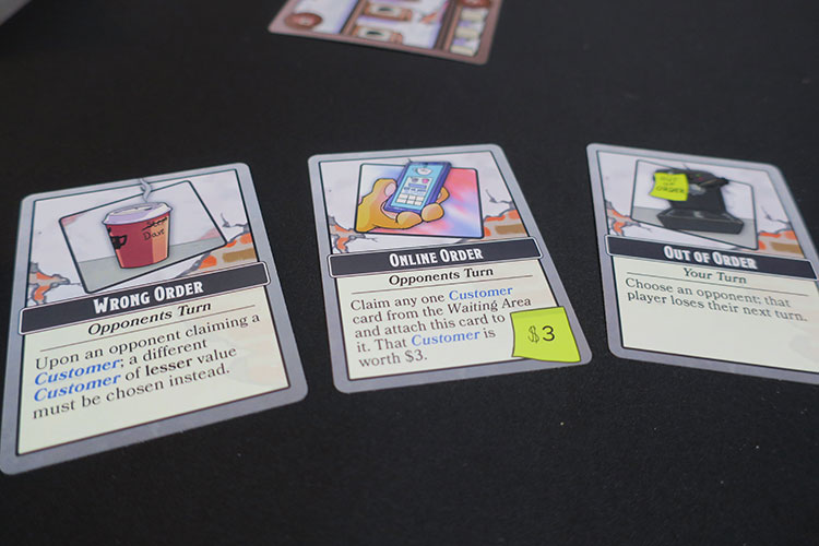 I mentioned that there might be ways to mess with other people, so let’s talk about that. Scattered throughout the ingredients deck are special cards. These can do a couple of different things and, depending on what they are, will determine when they can be played. Some cards can modify the tip total either for a customer you are claiming or against an opponent. You might also be able to spill an opponent’s drink, keeping them from fulfilling their order. The customer deck also has some special cards. They can impact the tips and even the available customers, including replacing all those in the waiting area. Some of these cards aren’t too mean, but some parents may hold off playing these against their younger baristas.