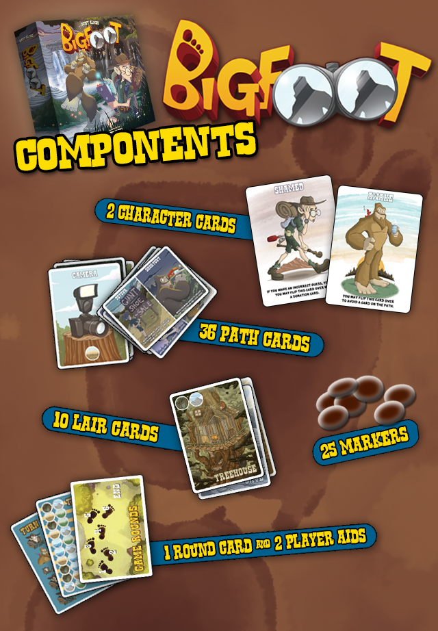 Each round, the Cryptozoologist lays out two paths peppered with secret sensors and waits for the Bigfoot to come along and choose a path. The sensors tripped by the Bigfoot give the Cryptozoologist clues about the locations of the Bigfoot’s five lairs.
