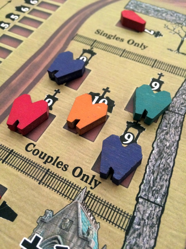 The Undertaker cards reveal how many spots the grave cart has for this turn. The eight cards in the game vary in the number of spots available. On the game board, the cemetery is separated into two sides by the river. The first player that turn decides which side of the cemetery the coffins in the cart will be buried this round.