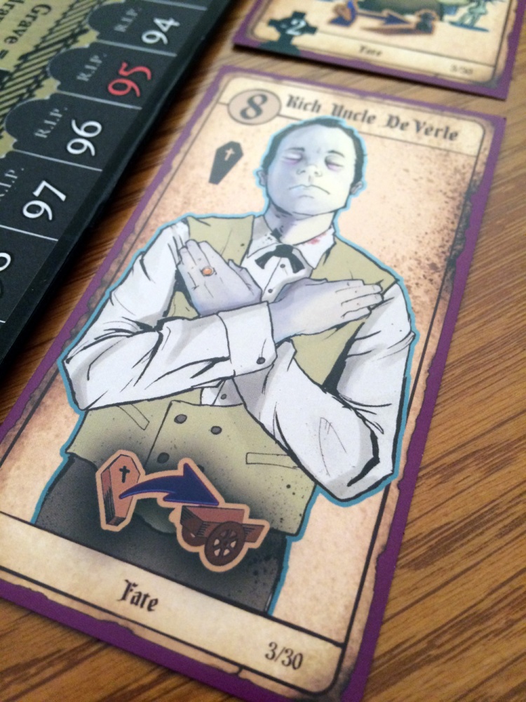 I like the limited space mechanic on the Undertaker cards. This forces players to attempt to read the other players before they play their cards, because if don’t, you will lose too many coffin tokens to the river. This deduction happens because everyone has, at minimum, the same five cards in their hand. They might have a Fate card that does some manipulation, but without having these base cards, you couldn’t make any guesses about other player’s actions. This leads to a lot of player interaction in the game not only in the resolving of actions, but also the limited spaces on the board. I do like how the cemetery is separated into two distinct areas. This not only adds a layer of strategy for the player, but allows for each area to be unique. Each side having distinctive plot areas gives players something else to think about as they place their bids. Being aggressive with a Fate card could net you the last, or the last couple only spot, and force your opponents to change their strategy.