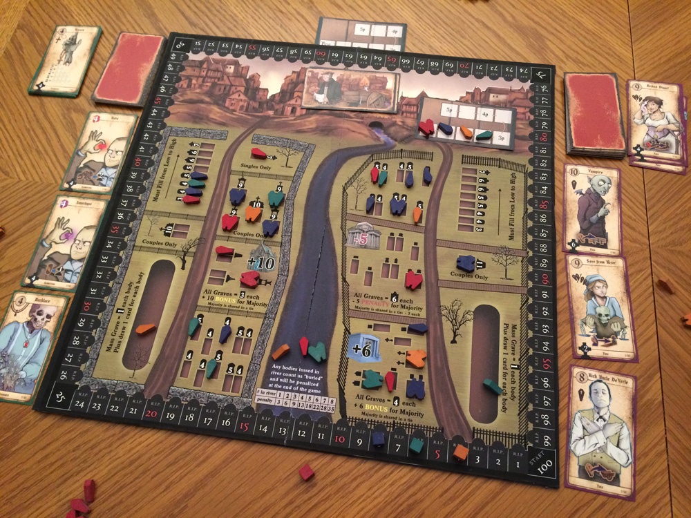 The head of your family has died. The will has been read and you are last in line to take over the family. This doesn’t sit well with you. You have decided to take matters into your own hands and improve your position. The dirty work has been done, but now you need to get your family members into the most exclusive cemetery in the city. You thought this would be the easy part, but two things came up that you didn’t expect. One, that there people would be making the same power move in their families causing more competition in the cemetery and the laziness of the Gravedigger. Each day he only has a limited number of spots in his cart and for each one over his limit, he will toss them into the river. Players will have to bid effectively to get their coffins not only buried, but also in the best spots. You might even be forced to do some grave robbing and grave swapping to earn the points necessary to win the game. After eight rounds of play or when one player has placed all of their coffin tokens on the board, you will total up victory points and the player with the most wins the game.