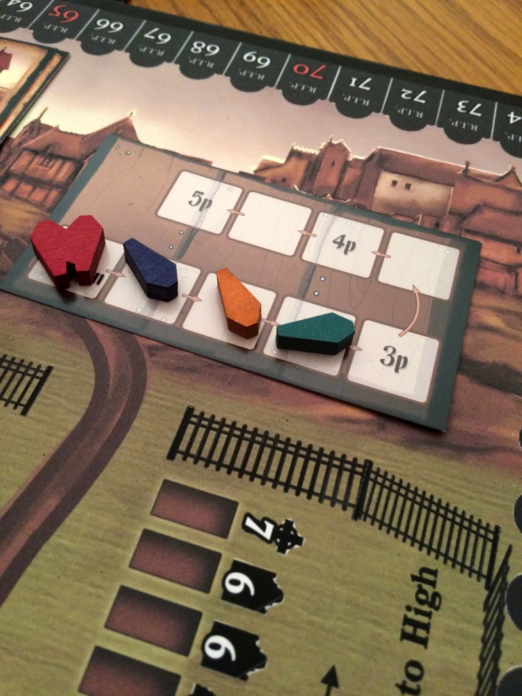 After all bids are placed, players will flip over their three cards. All cards are resolved in order of rank, with ties being broken by starting with the first player and continuing in clockwise order. Depending on which cards are played, a player may add coffins to the cart, manipulate coffins locations, or earn victory points.