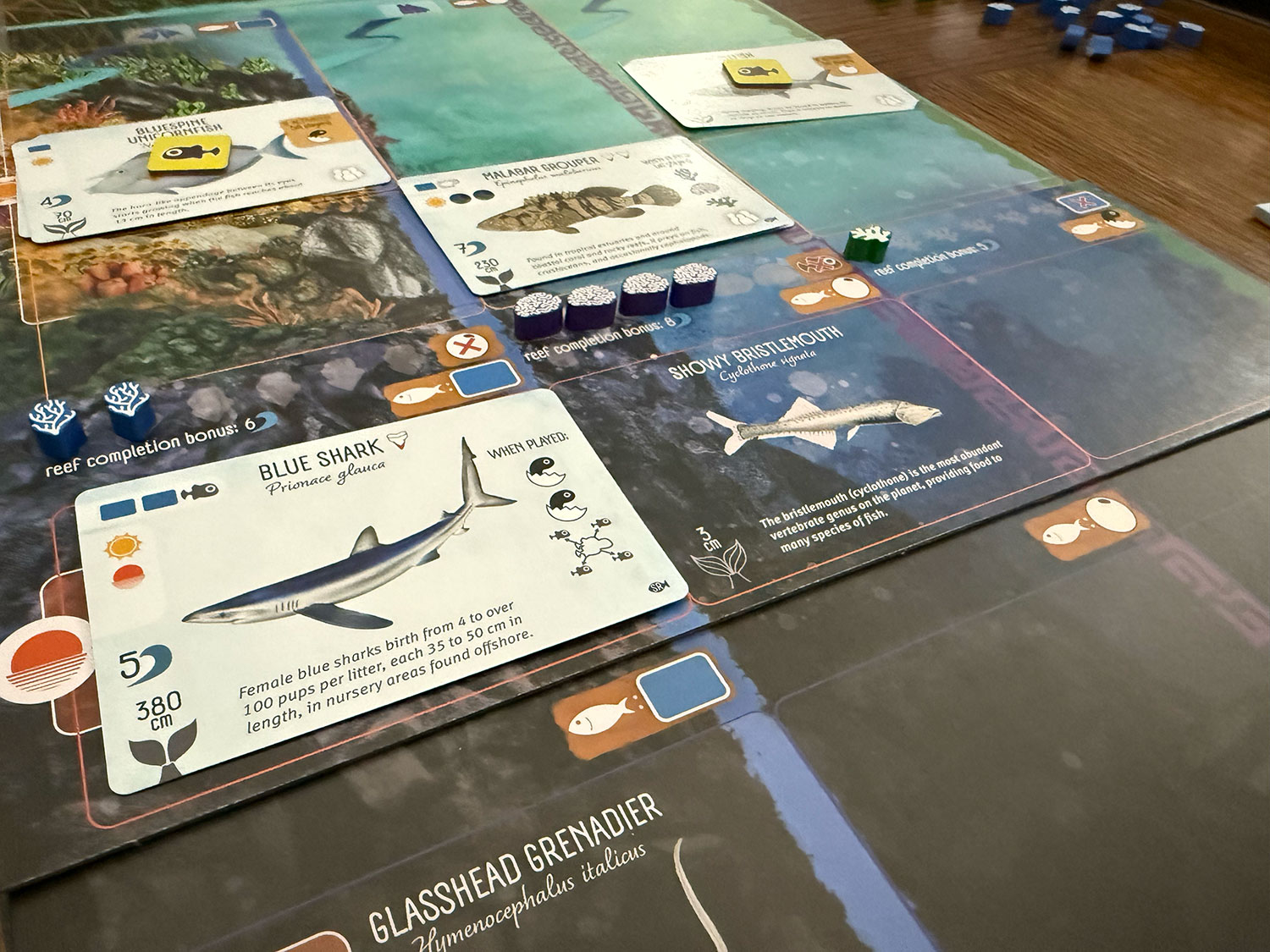 Finally, similar to the base game, the art of the new fish is amazing. I also enjoy reading the informational text at the bottom of each fish card. And the scope is fantastic. You will get to play with well-known fish, like barracudas, groupers, and sharks, as well as fish that only the most experienced oceanographers are familiar with, such as the Yokozuna Slickhead or the Ribbon Sawtail Fish.