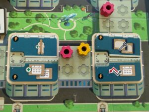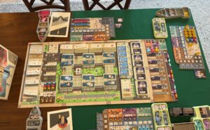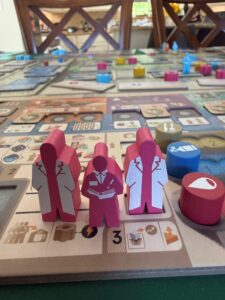 - “Call a meeting” which brings all your workers back, earns you a small bonus for each worker who attend the meeting, and then do one action (chosen from a subset of all actions based on where your “developments” are on the board.