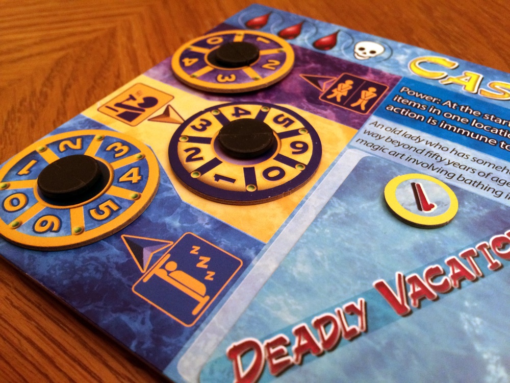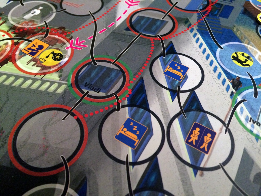 The main board is littered with circular spaces for players to move around the resort. These spaces will denote different types of locations by the colored circle around it. Some will show direct and ranged kill locations that players will be able to take out their target directly, while others have too many witnesses present and players can’t be killed there. Also, there will be locations to take care of those pesky basic needs.