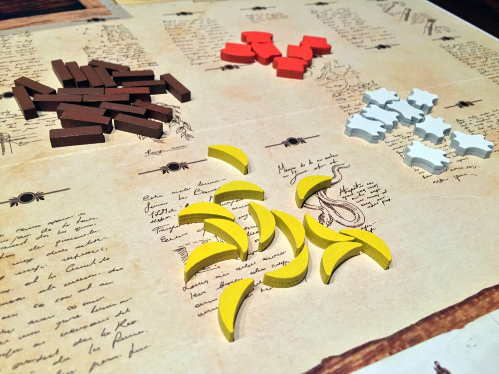 Originally Published by Portal Games (and Z-Man here in the USA), the components in Robinson Crusoe are pretty solid, if not exciting. The cards are sturdy, the art is great and I love all the scenarios. The four resources in the game are food (temporary), food (permanent), furs, and wood. I’m sure you’ll be shocked to hear that they are represented by a set of colored wooden cubes in the game. To go along with that, the player tokens in the game are wooden discs of various colors. Do they all work? Sure, but can we do better? Absolutely!