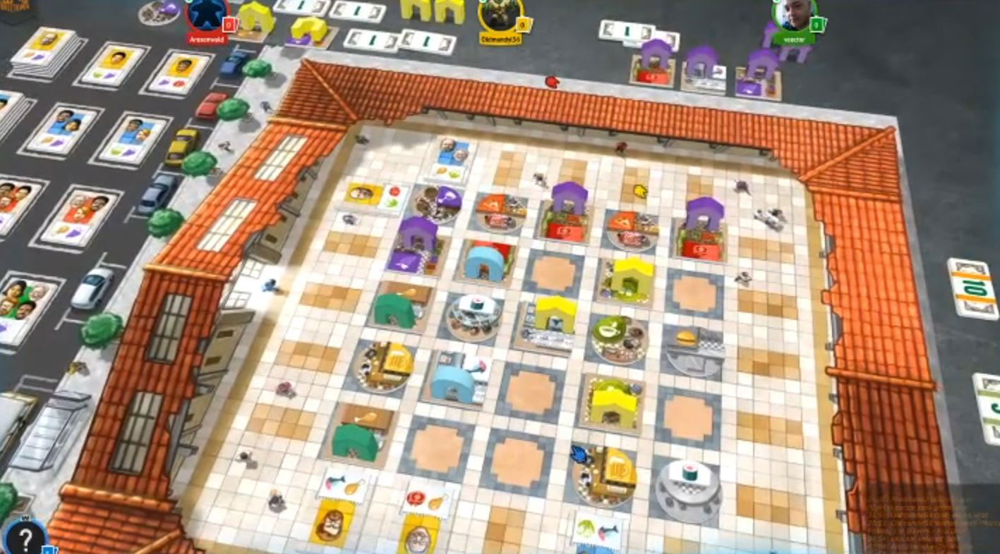 The game ends when there are only four remaining spaces on the grid or four remaining places for customers to be placed. Each unplayed restaurant a player holds costs one dollar, and whoever has the most money is the winner.