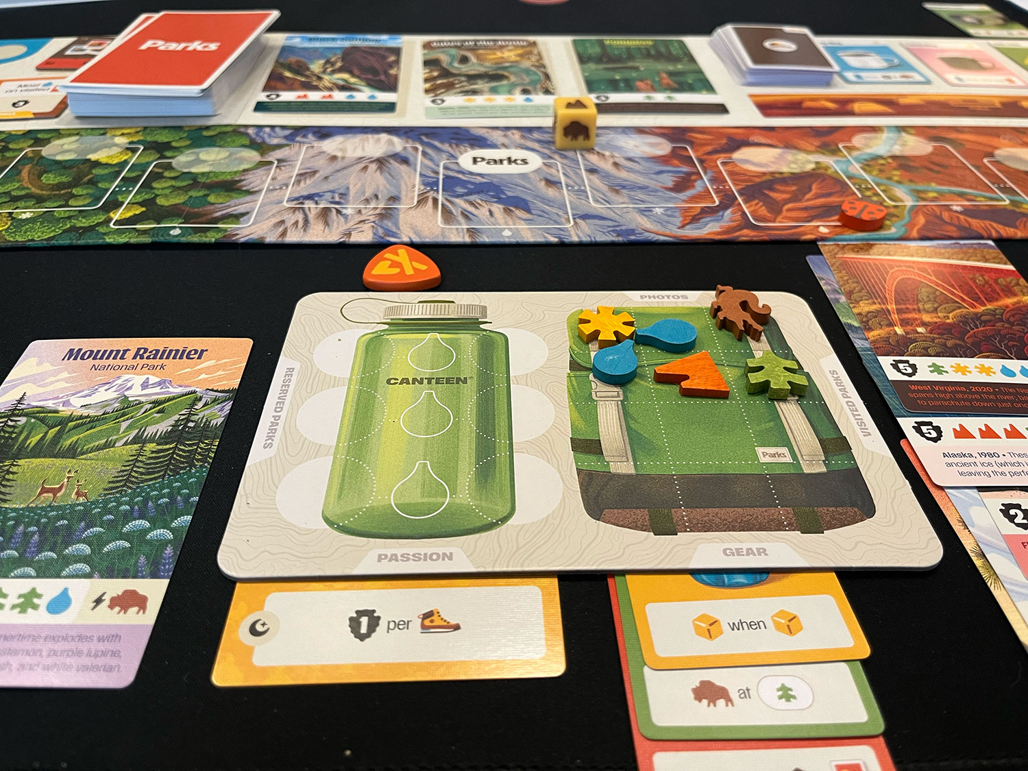 Like its predecessor, I find the new installment of Parks to be a quick-moving game. While you can certainly plan ahead by anticipating where you may want to move your hiker, or have your eye on a certain gear card, canteen token, or park, gameplay tends to stay fast and fluid. Evolving gameplay choices are economically streamlined and immediately impactful. Among my play group, the combination helped move the game and avoid delays due to players’ over-analysis.