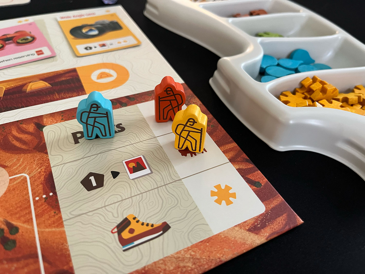 I enjoy the light interaction that Parks provides. The first hiker to the finish line of each round collects helpful rewards such as going first next round, getting a discount on a gear card, or a wild resource. So, timing when you make that leap is important, as your plans can be easily foiled by an opponent who picks up on your play style. Players can also strategize about how to make use of their park destinations. Do you want to visit a park now, or would it be more advantageous to reserve a park visit for later—and in the process thwart an opponent who is eyeing up the same park?