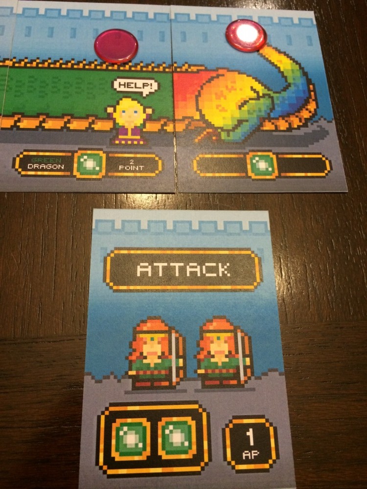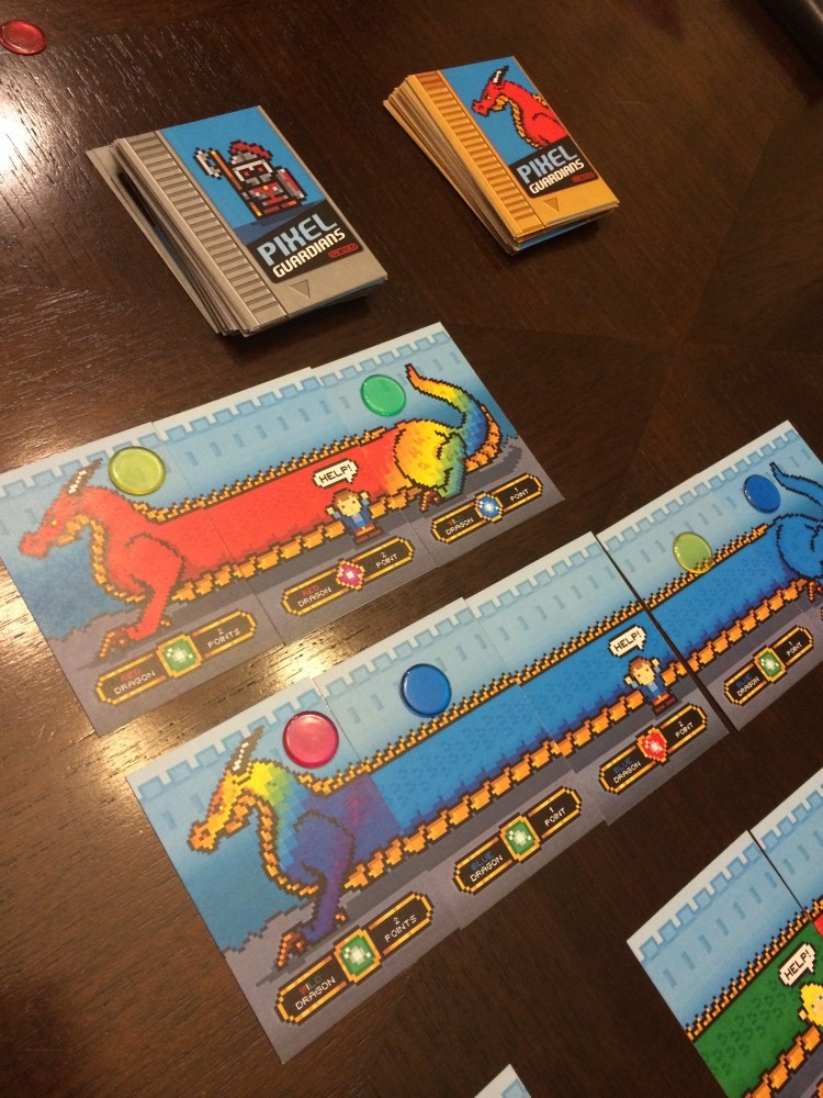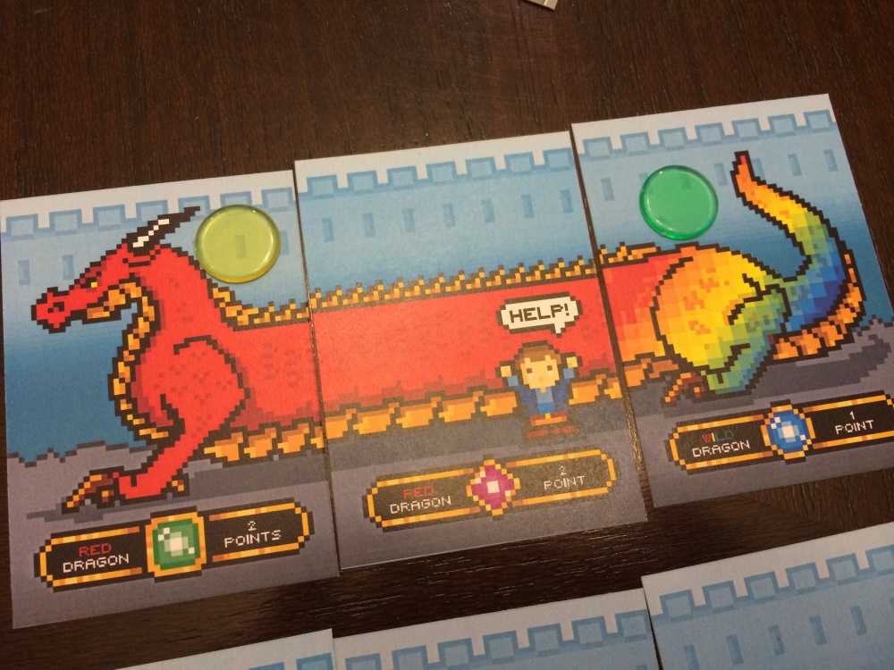 In Pixel Guardians, players are competing to conquer dragons as they appear in the kingdom. Players play attack cards to capture the head, body segments, and tail of each dragon by matching up symbols on both the attack card and the dragon part. Different parts are worth varying point values, with bonuses given for rescuing villagers. The player with the most points at the end of the game wins!