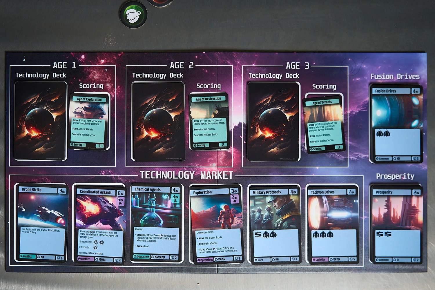 In Solarion: Foundation of Empires, players are vying for galactic dominance through area control and deck building. By colonizing planets and controlling sectors, players work to build out a formidable space fleet to fight, defend, and extend their presence throughout the galaxy. The game is played over three Ages, each containing decks that serve as a countdown and fill the Technology Market with buying options. At the end of each Age, players score points based on criteria selected for that Age and the areas they control. The game ends either when the final Age’s deck has run out or a player uses their final Colonist. The player with the most points wins.