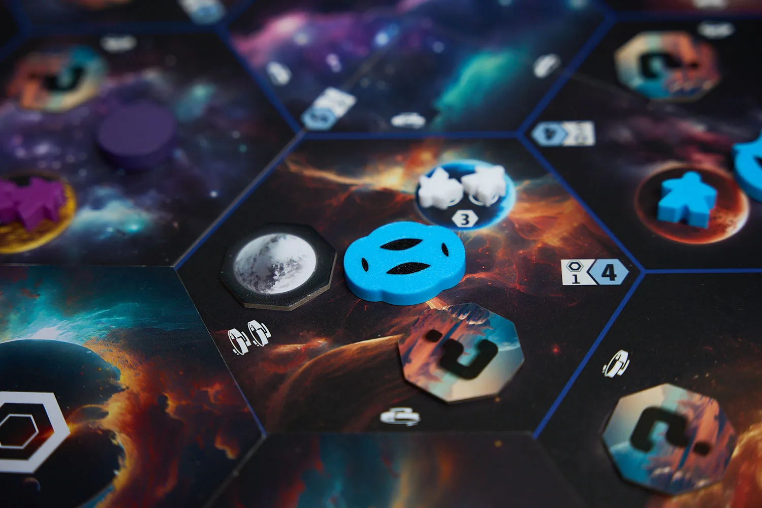 The game offers setup options for a tutorial game and player counts. Sectors, which can be placed in numerous ways during setup, contain planets, warp gates, and star gates, which help you jump around space a bit faster. There is the nucleus (single hex at the center), inner sectors (placed around the nucleus), and outer sectors (which contain star gates). With so much variety in setup, coupled with Age scoring opportunities and different species that players can play (i.e. unique starting bonuses), you’ll never play the same game state twice.