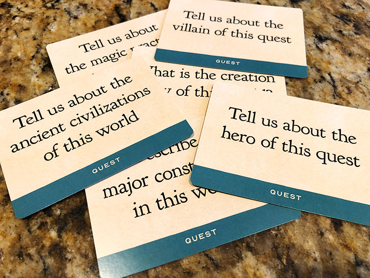 Once everyone is ready, the responses are collected, shuffled, and passed out randomly to each player. Players then take turns reading the response that was handed to them. After all of them have been read, players secretly vote on which one they liked the best. The response that got the most votes becomes the quest for the group’s tale, with the player who wrote it becoming the storyteller for the next round.
