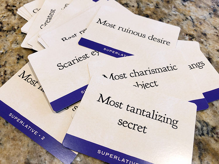 Scene rounds work similar to the quest round. To start, the Storyteller draws three phrase cards, three superlative cards, and chooses one of each. So a phrase might be “Like all great cowards” with the superlative being “Most destructive character flaw”. The superlative is important because it creates the condition that players will score each other’s scenes on. The phrase itself is required to be in the scene players write. Once all players are ready, they have five minutes to write their scene.