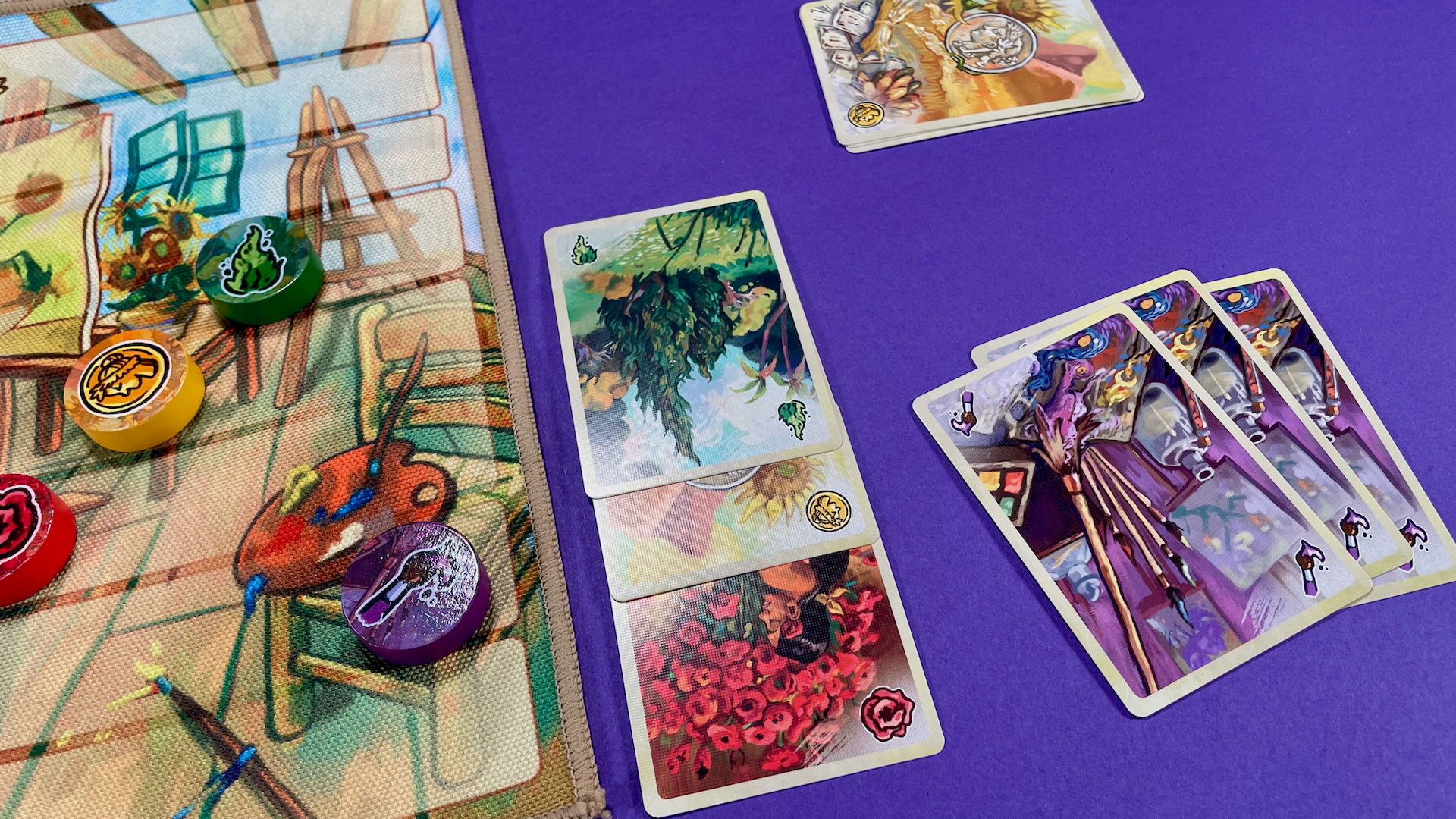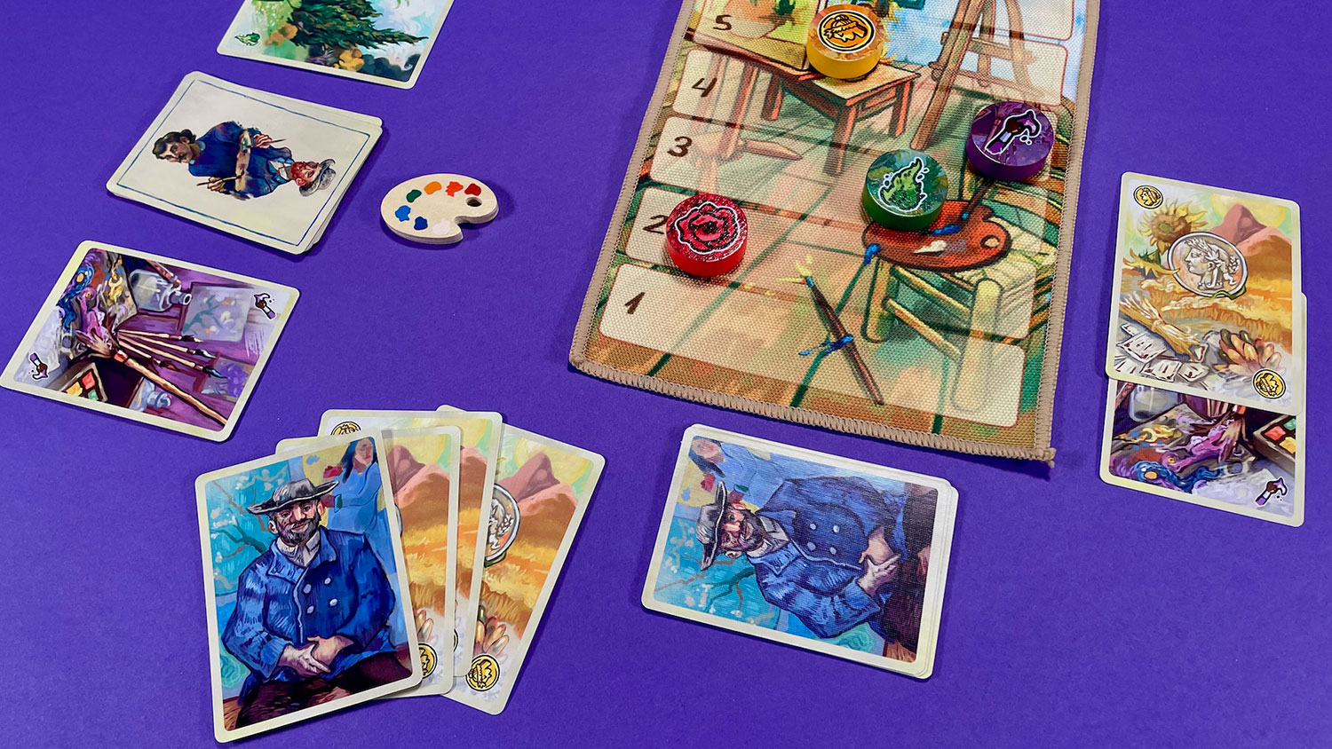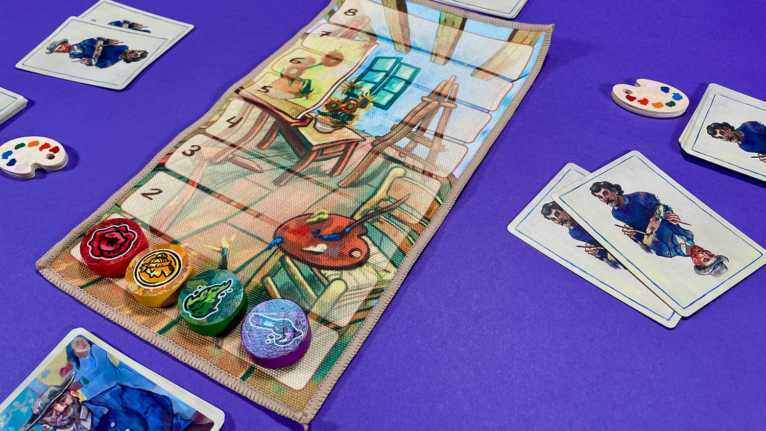 Once a player successfully empties their hand of Topic cards, the card used to make the most recent Claim is taken as a reward and placed face-up under the Palette token to track the win condition.